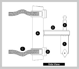 A - Main bracket with protective non-skid surface B - Load-rated ratching buckle C - Interchangeable white web strap D - 5" or 12" extension arm E - 3-1/2" baby stud F - 5" Jr. receiver with T-handle |